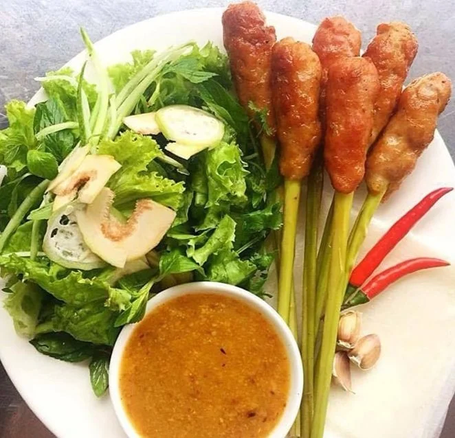 Grilled pork skwered on a lemongrass stick and served with rice paper and fresh vegetables. Best served rolled up in rice paper and herbs. Comes with an especially pungent (but delicious) peanut and liver paste sauce.