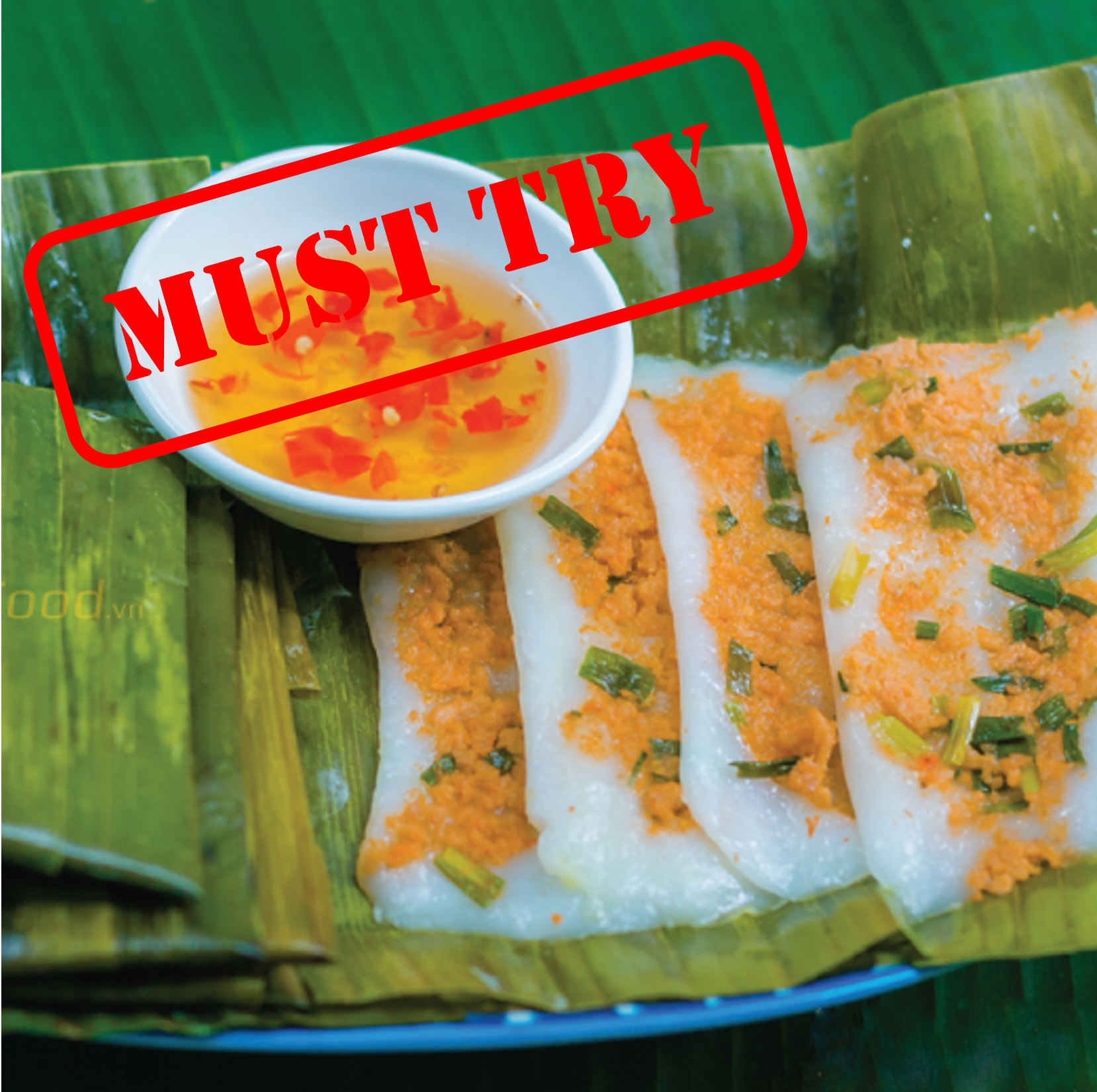 Flat rice ‘dumplings’ filled with seasoned shrimp and pork, steamed in banana leaves. A ‘cannot miss’ and Sam’s favorite “Huế cake”’!